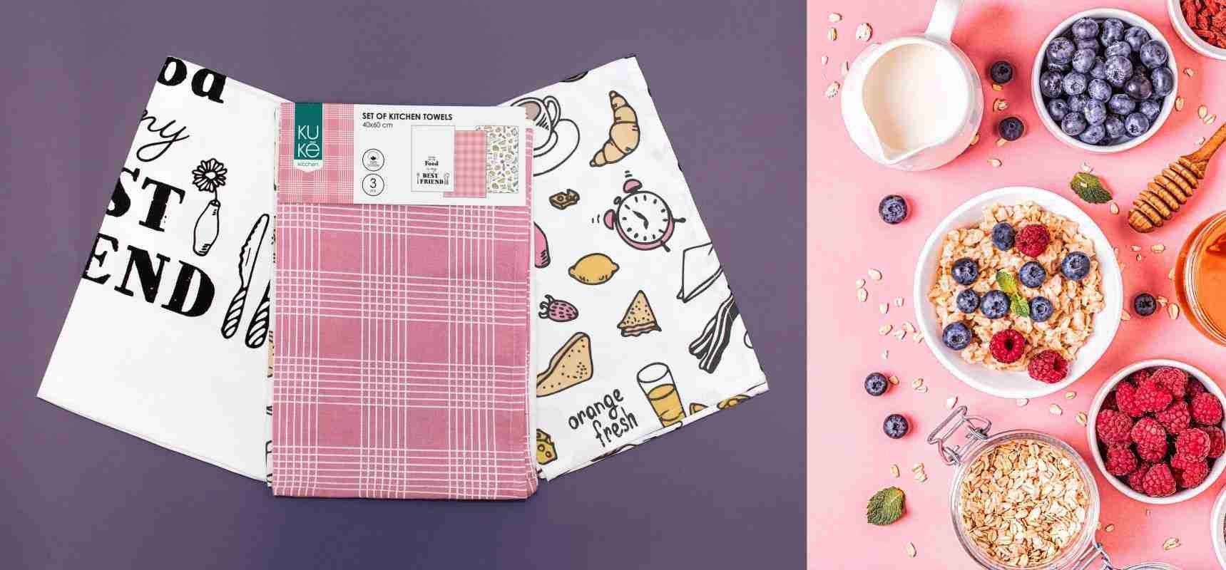 Štýlová sada troch kuchynských utierok „Kuke” s potlačou raňajkových motívov je praktickým pomocníkom aj modernou dekoráciou vašej kuchyne. Utierky o rozmere 40×60cm sú vyrobené zo 100% bavlny, majú dobrú savosť a príjemný materiál. Vďaka kvalitnému spracovaniu a elegantnému dizajnu sa hodia na každodenné použitie aj ako originálny darček.