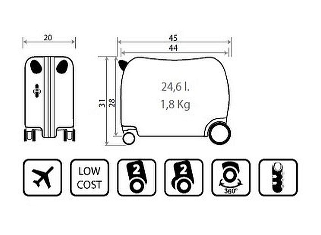 Dětský kufřík na kolečkách pro kluky i holky, velmi kvalitní skořepinový obal, odolný proti nárazům a poškození vnitřního obsahu kufru. Na tomto kufříku mohou děti jak sedět, tak i popojíždět jako na odrážedle. Přední otočná kolečka pro lepší manipulaci. Rozměr umožňuje použití též jako kabinové zavazadlo vhodné i pro nízkonákladové lety. Nosnost kufříku 30 kg.