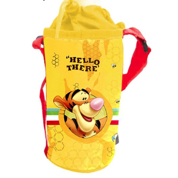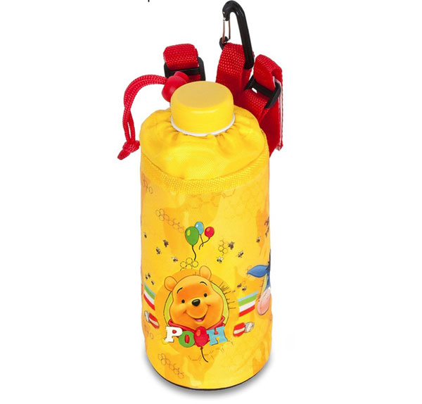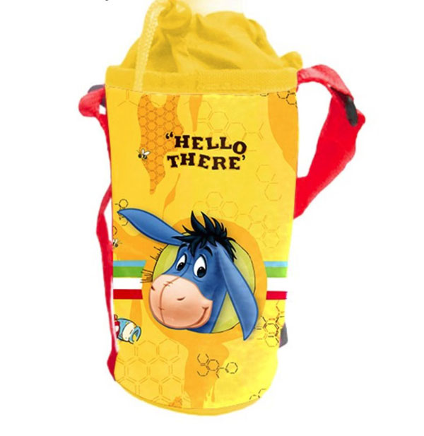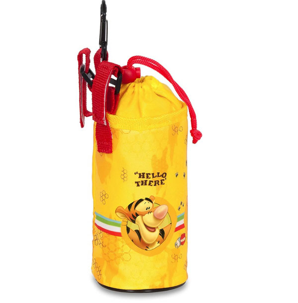 Moderní a inovativní držák na láhev Medvídek Pů určený pro děti, které přenášejí nápoje při jejich venkovní aktivitě. S univerzálními rozměry může každý zabalit svůj oblíbený nápoj o objemu 0,5 l, nebo 0,33l do tohoto držáku a vzít si ho pohodlě s sebou. Textilní držák lze snadno a rychle připevnit k řidítkům na kolo nebo koloběžku, nebo připevnit k batohu díky zavírací přezce. Držák je polstrovaný a má zatahovací gumičku pro pevné udržení nápoje uvnitř. Připevňujte s pomocí pásků se suchým zipem, pásky lze velikostně nastavit. Textilní držák je vyroben z odolného a snadno čistitelného materiálu zdobeného Disney motivy.